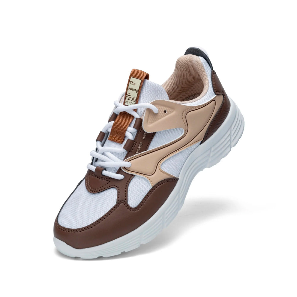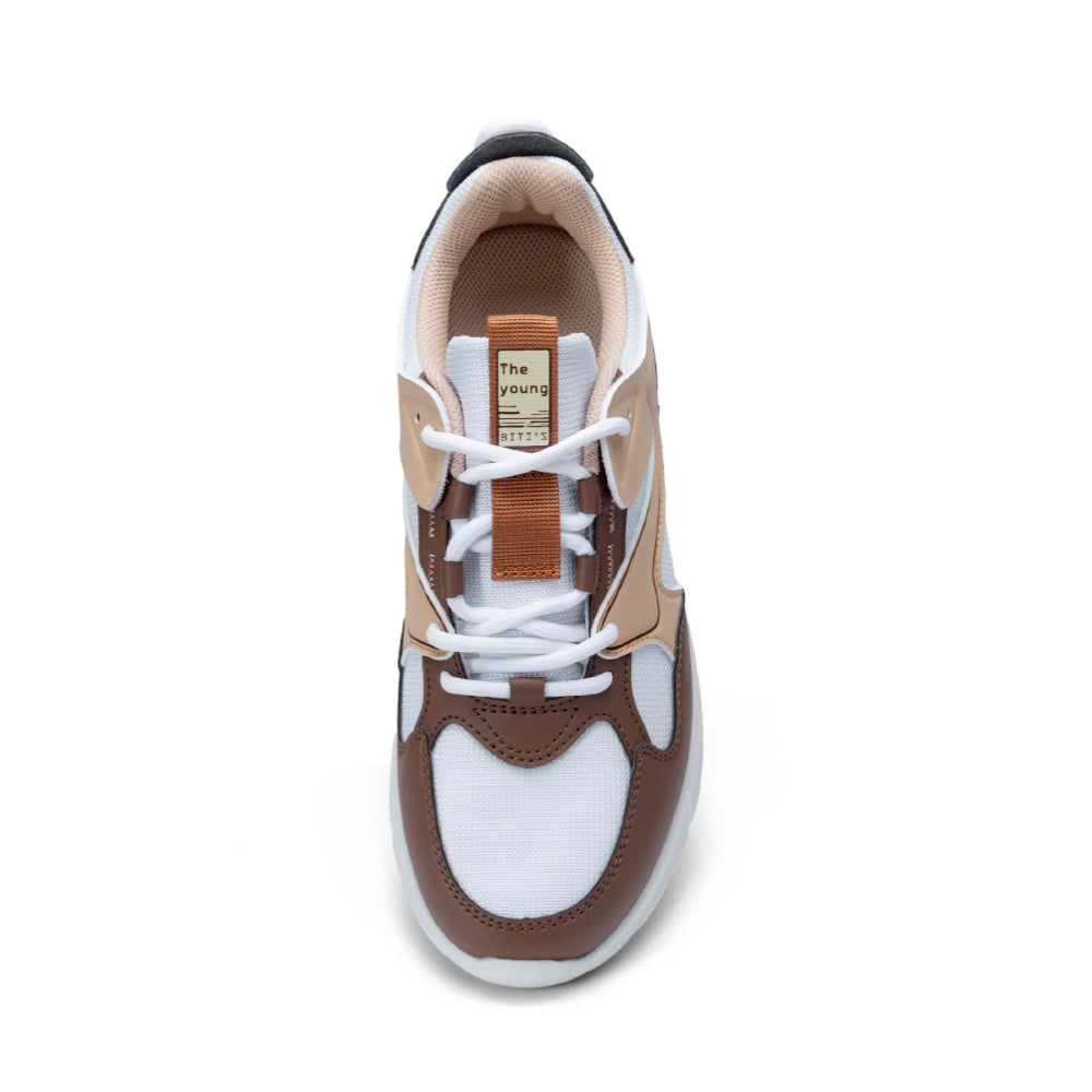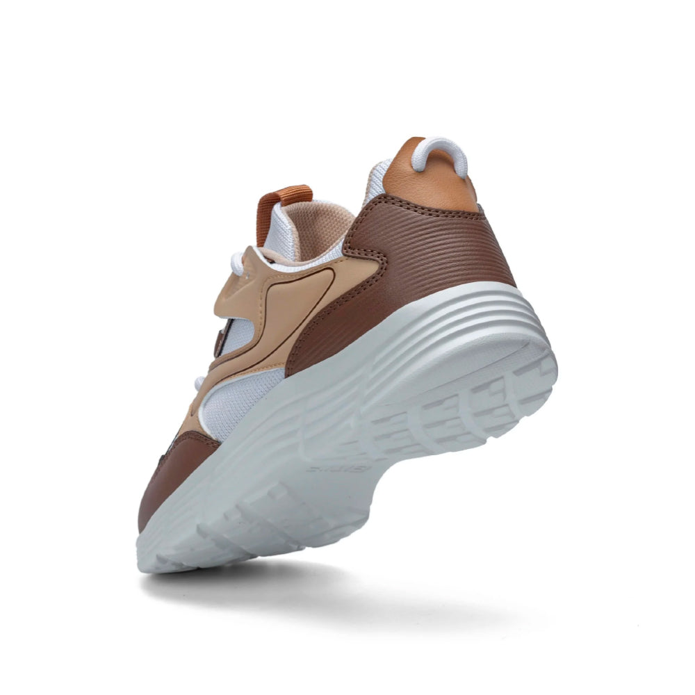 Helio II es un modelo de zapatilla con un espíritu minimalista, elegante y sofisticado, extremadamente adecuado para adolescentes que buscan un estilo escolar moderno. La combinación de colores principal blanco con detalles en marrón beige crea una apariencia general suave pero sobresaliente.