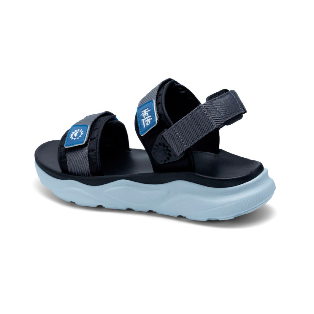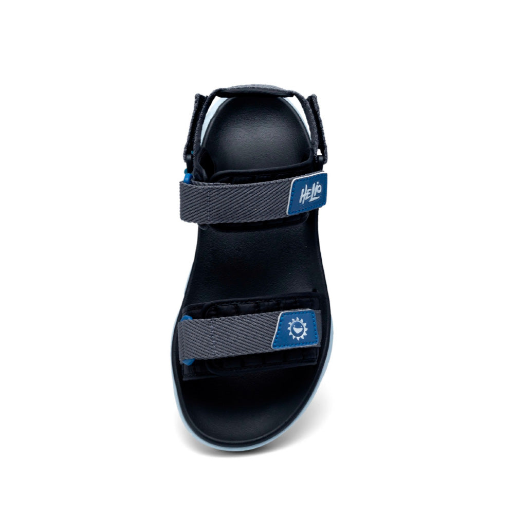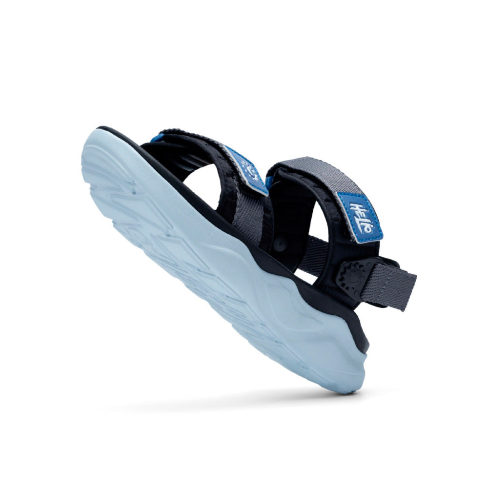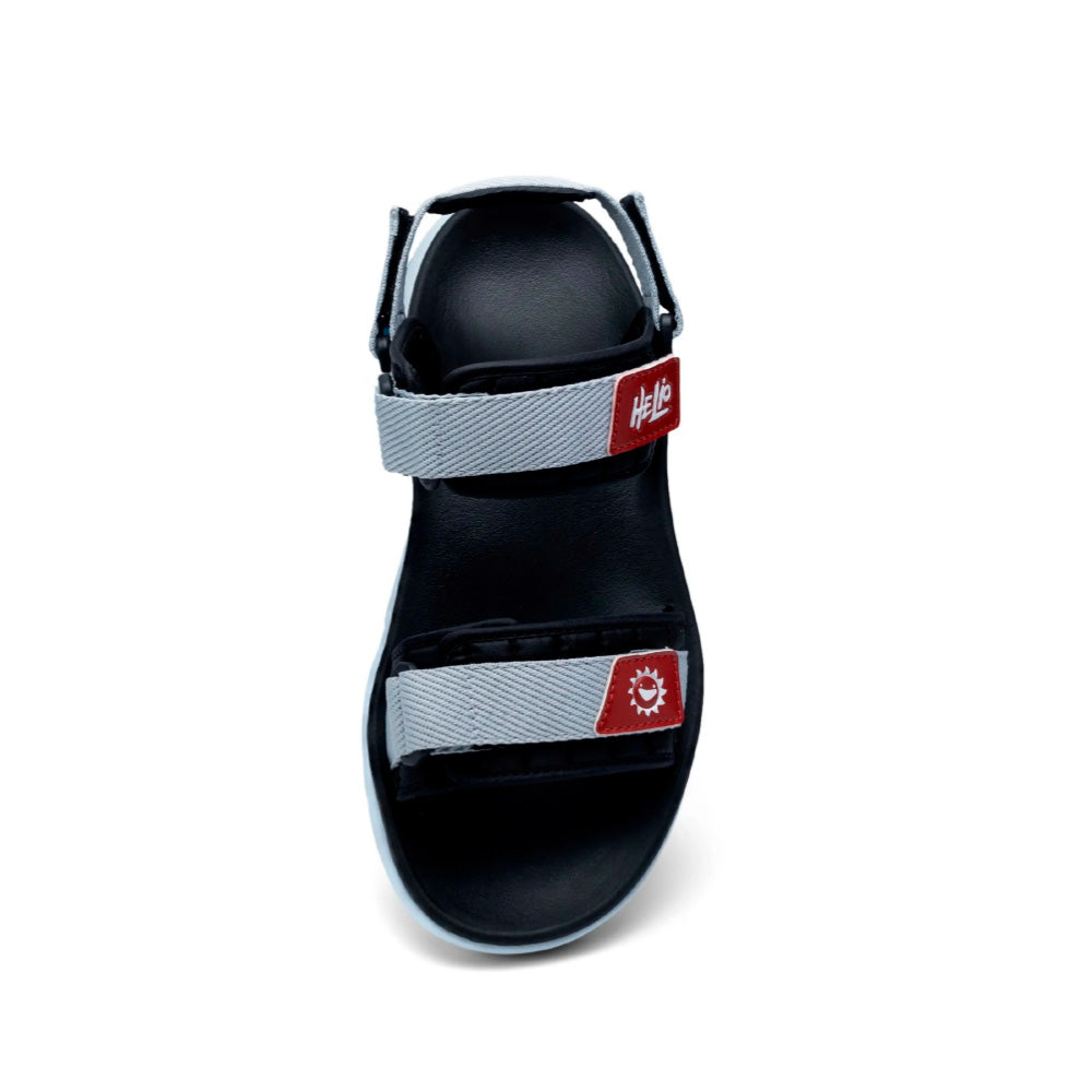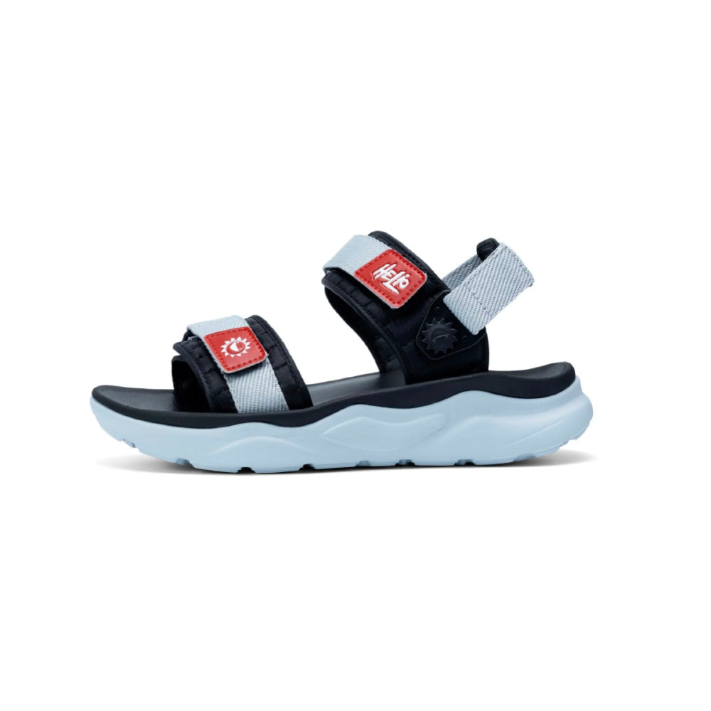 La correa de tela ancha está diseñada para ser resistente, se abre y se cierra con un cómodo velcro y se ajusta fácilmente a la forma del pie de cada persona. El logotipo de Helio y el símbolo del sol en relieve sobre fondo rojo son los aspectos más destacados que hacen que las sandalias sean únicas y diferentes.